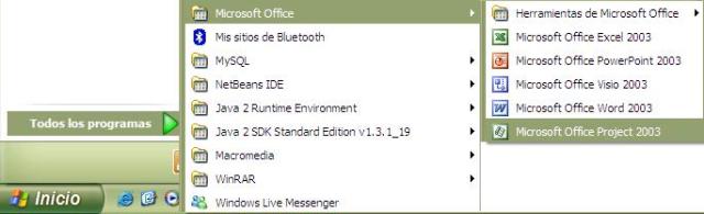 Luego de instalar Microsoft Project, abrimos la ventana principal, dando click en el menú Inicio de Windows, luego click en Programas, posicionamos el cursor en Microsoft Office y finalmente click en Microsoft Project. La selección se vería de la siguiente manera: