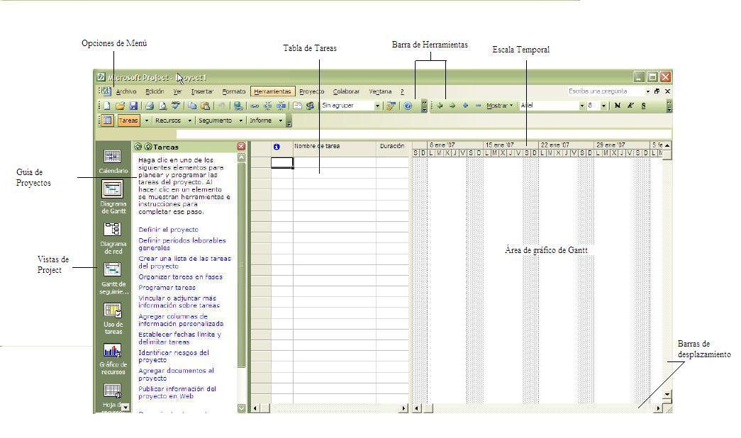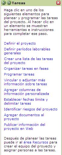 El Panel de Tareas es similar a la guía de proyectos, nos proporciona ayuda para la creación de Tareas, definición de Recursos, dar Seguimiento a los proyectos y la preparación de Informes.
