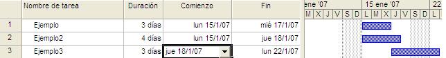 El área del gráfico de Gantt muestra gráficamente cada una de las tareas. La posición de la barra en la línea de tiempo, así como su longitud, indica cuándo comienza y finaliza esa tarea. Además, la posición de una barra de tarea en relación a otra indica si las tareas se suceden o se superponen.