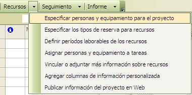 En el menú Recursos podemos definir los elementos que nos ayudan a preparar el proyecto, las opciones son las siguientes: