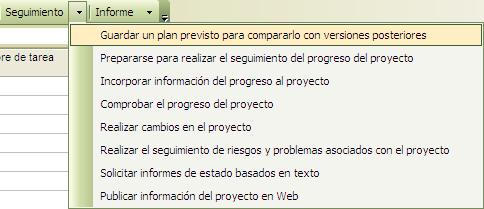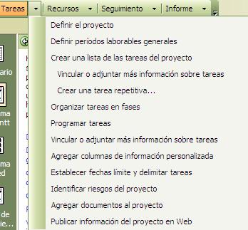 El menú Tareas tiene muchas de las opciones de la Guía de Proyectos, el menú se presenta así: